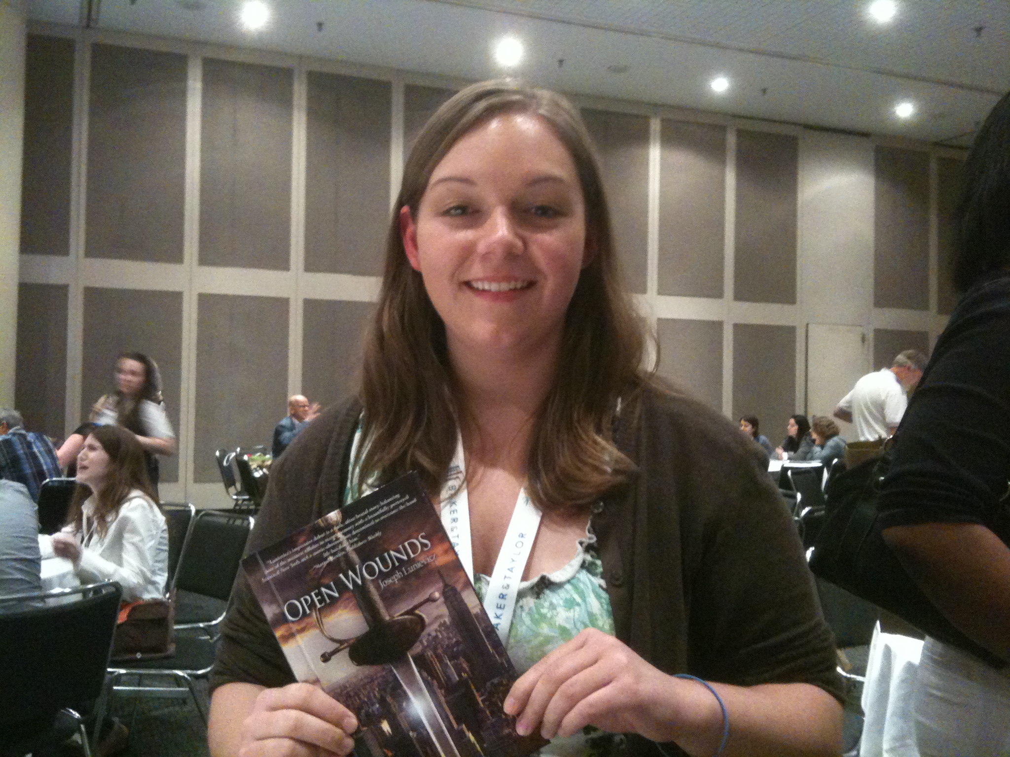 Yesterday I received my first in-person request to sign a book. Casey Blackwell, who YA book review blog is thebookishtype.blogspot.com, just as the speed dating session was over pulled out her copy of my book and asked me politely to sign her book. It was sweet and made me smile. She was kind enough to let me take her picture and gave me permission to post it. It was a nice ending to a flurry of pitches, card-giving out sessions, and trying to remember who I’d said what to and in what order. Casey’s got a great blog site and I look forward to seeing her review of Open Wounds there.