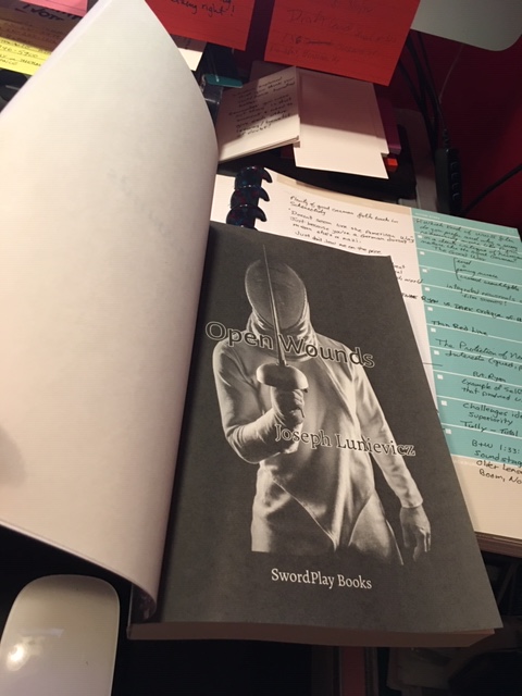 Yesterday two boxes arrived from Amazon. They were my 25 copies of the paperback edition of Open Wounds. I can’t tell you how good it feels to see my book in print, with a new cover, a beautiful font, perfect size and heft, and a new beautiful black and white picture of a competitive epee fencer next to the title page. Stephen Khinoy, my new editor/publisher at SwordPlay Books, did a wonderful job of bringing my book physically to life, again. Steve was a competitive fencer himself and knows fencing inside and out. His catalog of books is about fencing one of my two favorite sports ever (the other is Rugby!). Check out the picture of the epee fencer after the inside title page (picture below). He also did the work on the cover himself. Steve, we need to have a celebratory beer/wine after the holidays! Word of advice to new writers. There are still small presses out there with editors/publishers who care about books and publishing. They are rare and their space in the publishing world is getting smaller and smaller. But they are still there. Find one who loves your book and let them bring it to life.