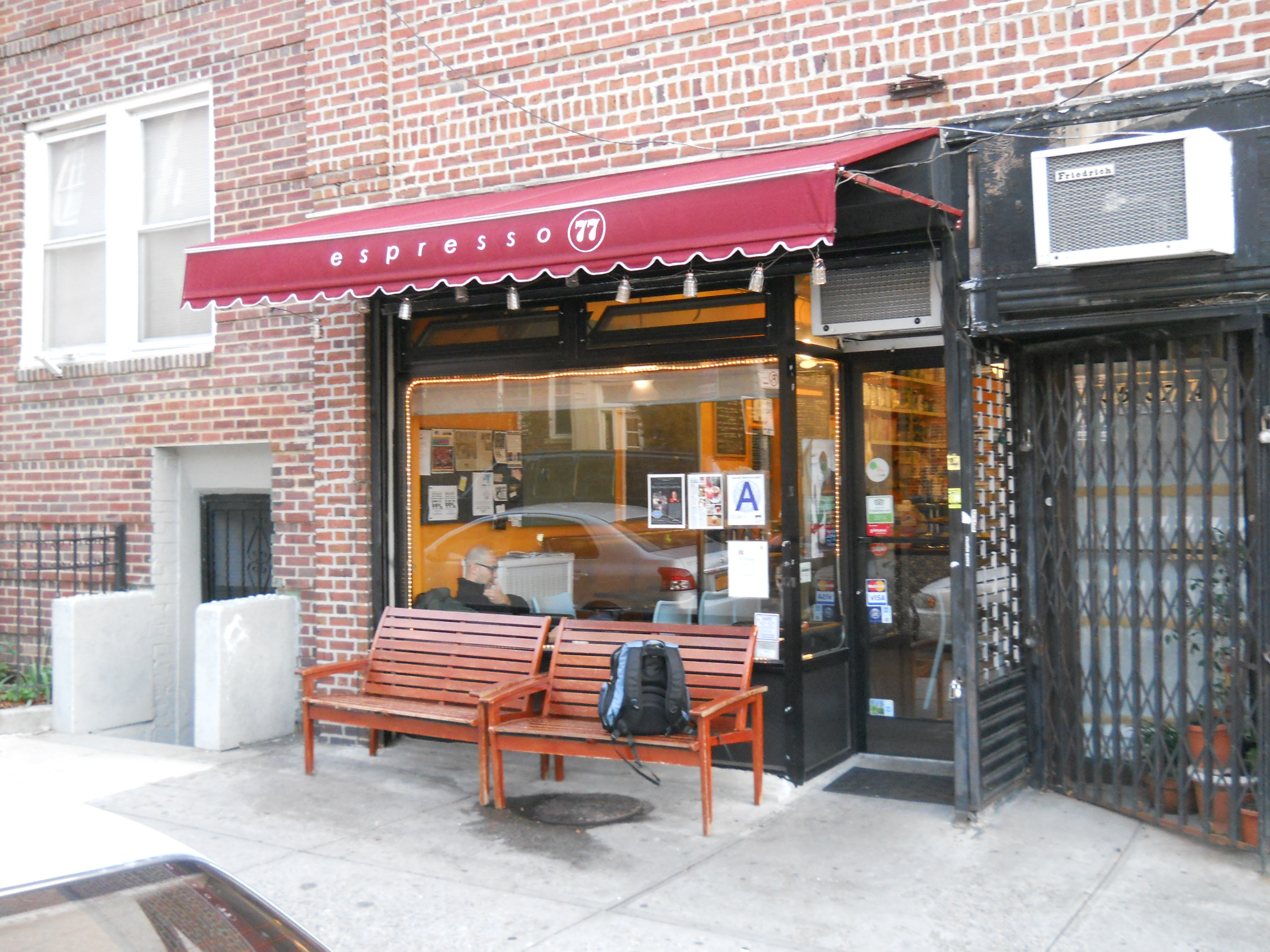 I wore my Espresso 77 t-shirt which says, “I love espresso,” on the front and Espresso 77 on the back. The writing is in white and red. The t-shirt is black. I wore my special, thick, writer-ly, wool coat. It doesn’t have elbow patches. It is slate black. And it is cool.