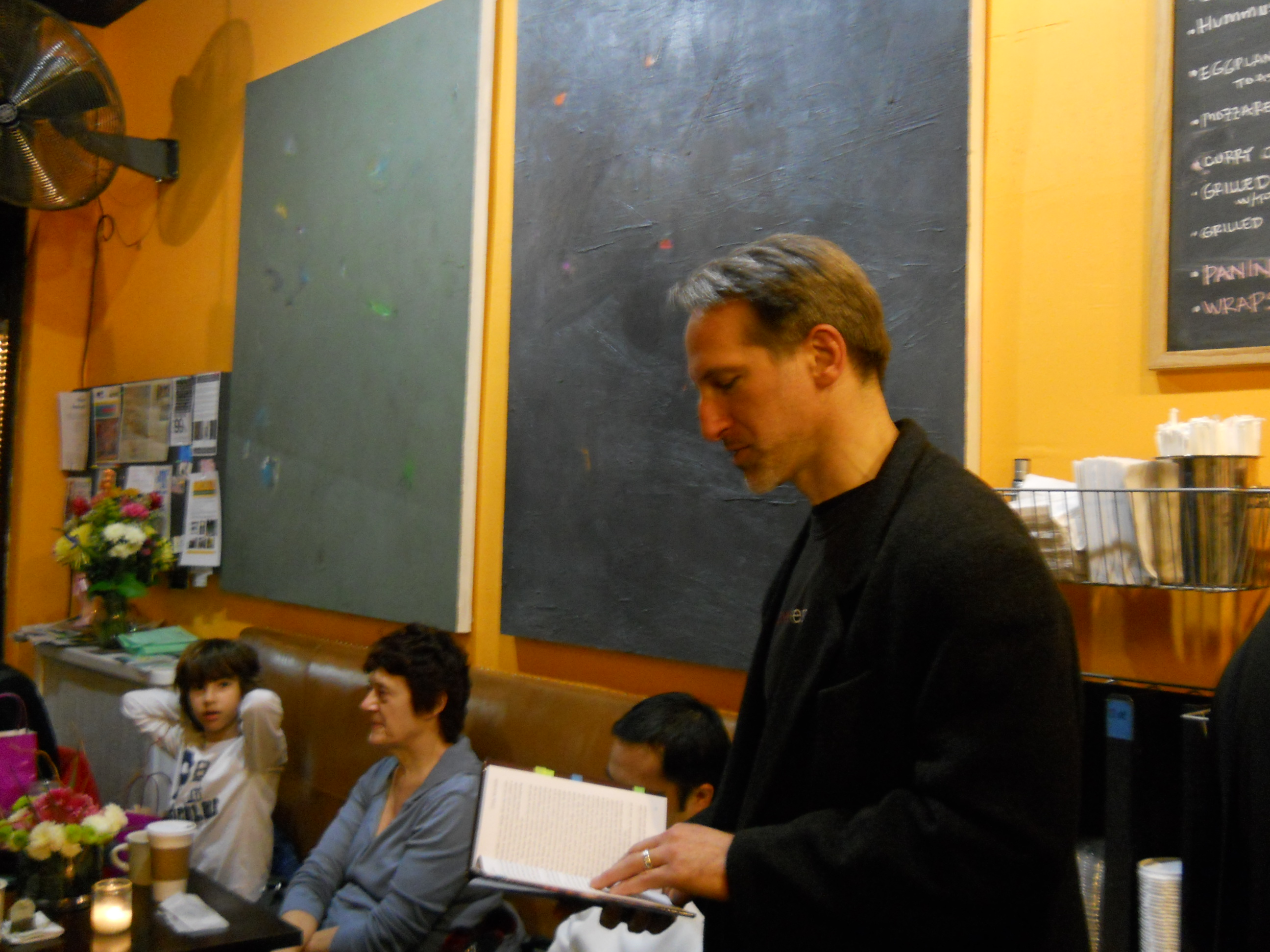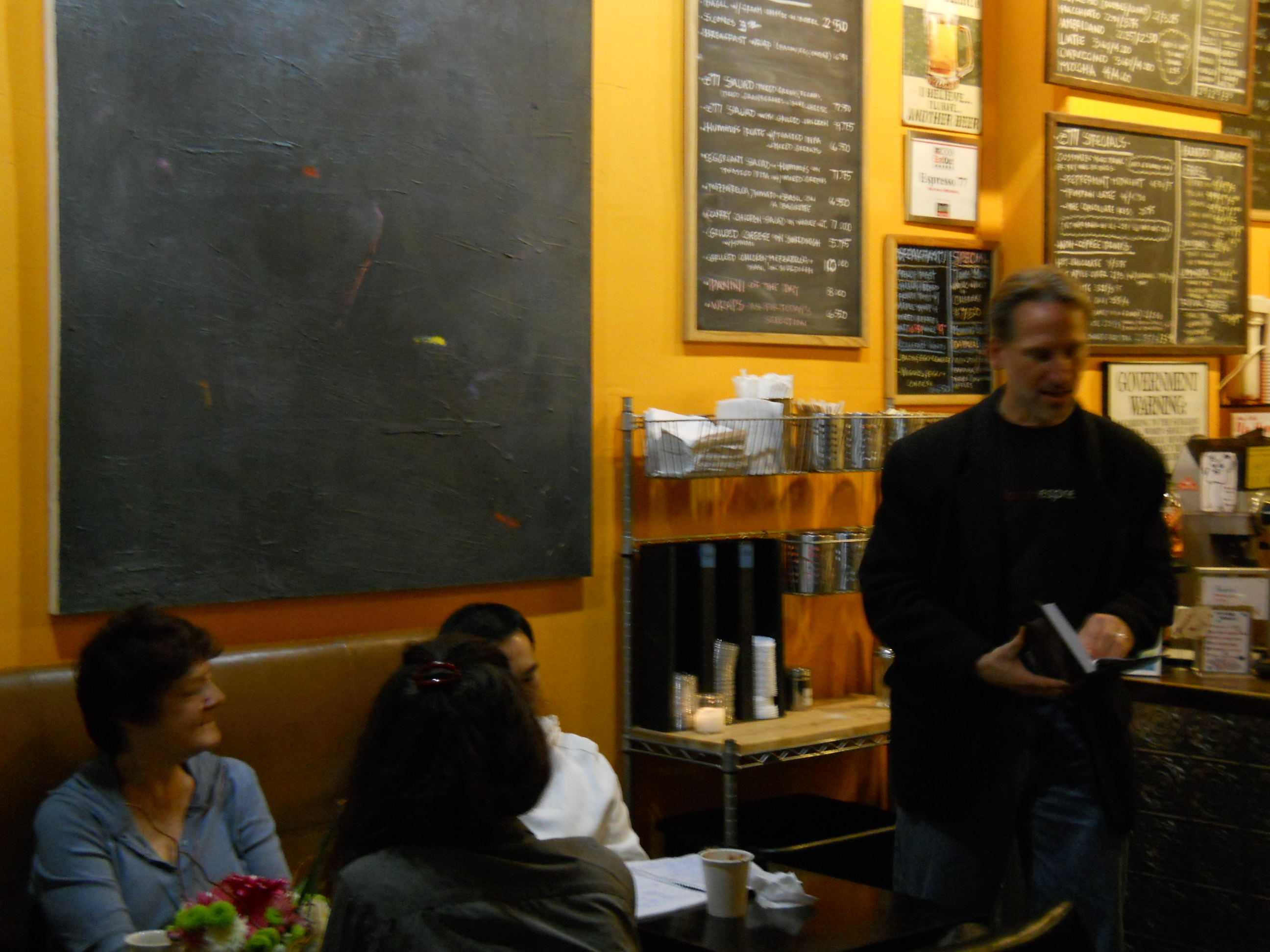 I read at Espresso 77 last night. My son sold books for me and gave out free mugs as gifts. Four friends, ten customers, and three employees listened in. I read the opening six pages of Open Wounds and the first five pages of the second part, The Bells of Hell – where Lefty is introduced to the reader and to Cid – the protagonist.