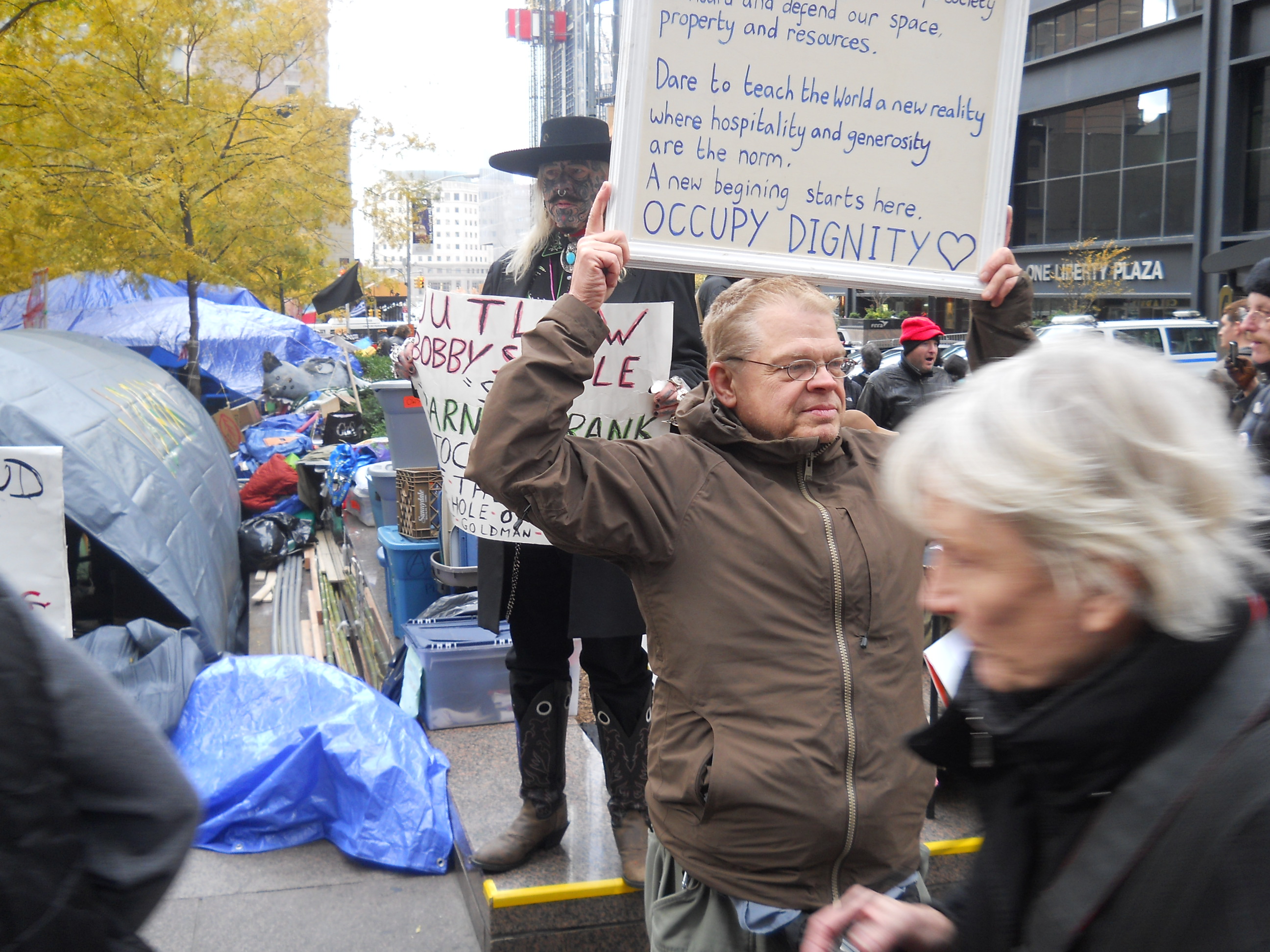 He shot some video (is in the process of editing as I write this) and I took some pictures. My wife tried to explain the whole thing to him. A couple of young men in the park handing out literature did too. Mostly I wanted him to understand that there are some things you can feel strongly about – so strongly that you take action to try to change them. One percent of the population controls the majority of our nation’s resources. So it has been for a long long time. Our politicians are afraid to address it. It is a powerful system based on money and the power that comes from it.