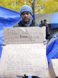 Oh… and the pictures are of Occupy Wall Street Zuccotti Park. We went on Friday, Veteran’s day, and took a bunch of pics. I also gave their library a copy of Open Wounds to add to their reading list. I’ll be putting up pics of the demonstration all week.