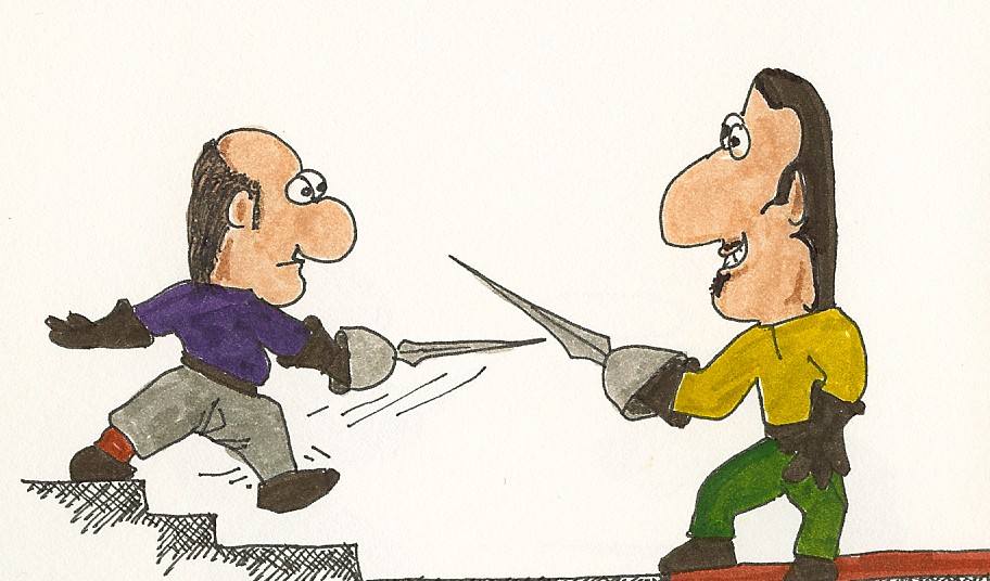 For example, I was fencing Coach Wrak (that’s really his name) in his backyard salle (fencing studio) where swords of all sorts hang from the walls in addition to his wife’s clothing, luggage, various exercise machines in various modes of disrepair, ancient torture devises (a cement brick with a rope tied to it and attached to a dowel that you hold in your hands and using wrist and forearm power tried to roll up), books (of which mine is one), stacks of fencing equipment, and a greenhouse looking ceiling and three walls, one of which is painted as a school mural with now curling strips of paint hanging off it. So… I was fencing Coach Wrak last Friday night and I was doing well, getting touches off his wrist and arm (we were fencing épée and the whole body is a target), scoring twice on straight attacks and once off of a deceive – and then there was the stop-thrust to the head that always cashes in for morale points. I was feeling cocky and he was getting a little frustrated – at least that’s how I’m reading it looking back. Then he gave me the open invitation – he relaxed a little in his on guard, opened his arms to show me his whole body was unprotected, and smiled at me, inviting me to attack.